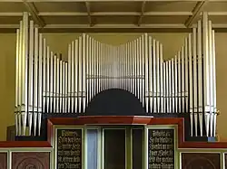 In der neuen Kirche stand zunächst ein Harmonium, das aus dem Vorgängerbau übernommen wurde und 1922 angeschafft worden war. 1933 wurde eine Orgel der Firma Aug. Laukhuff von Georg Schlosser aus Nieder-Ohmen in Eigenbauweise aufgestellt. Das Instrument mit einem Freipfeifenprospekt nach einem Entwurf von Walbe aus dem Jahr 1932 verfügte über fünf Register, die sich auf einem Manual und Pedal verteilten. Die Licher Firma Förster & Nicolaus schuf 1981/1982 ein neues Werk unter Einbeziehung des Prospektes und von vier Registern aus der alten Orgel. Ergänzt wurden Mixtur und Subbass. Die Kosten betrugen 65.400,30 DM.[13] Das Instrument besitzt sechs Register auf einem Manual und Pedal. Ein weiteres Register ist zum Ausbau vorbereitet. Die Disposition lautet wie folgt:[14]