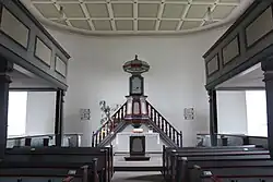 Die zentrale Stellung der mittig angebrachten Kanzel wird durch die symmetrische Ausführung mit seitlichen zweiläufigen Treppen unterstrichen. Die Holzkanzel aus dem 18. Jahrhundert hat einen polygonalen, gebauchten Kanzelkorb mit Füllungen in den Feldern. Eine Kanzelrückwand vermittelt zum baldachinartigen, achteckigen Kanzelkorb, dem eine vergoldete Spitze aufgesetzt ist. Als Altar dient ein Abendmahlstisch aus einem hölzernen Mittelteil mit überstehender Platte. Das hölzerne Kirchengestühl lässt einen Mittelgang frei. Im östlichen Bereich sind einige Bänke längs aufgestellt.