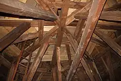 Der massiv aufgemauerte, spätromanische Chorturm auf quadratischem Grundriss ist ungegliedert und gegenüber dem Kirchenschiff eingezogen. Er stammt vermutlich aus dem Anfang des 13. Jahrhunderts.[3] Die kreuzgratgewölbte Halle im Erdgeschoss wird an den drei freistehenden Seiten von Spitzbogenfenstern belichtet. Unter dem nördlichen Fenster ist ein schlichtes hochrechteckiges Portal eingebrochen. Die beiden wehrhaften Obergeschosse haben horizontale und vertikale Schießscharten. Der hohe oktogonale, verschieferte Spitzhelm aus der Zeit des Kirchenneubaus entwickelt sich aus vier Dreiecksgiebeln.[1] Weil die Handwerker zu frisches Bauholz verwendet hatten, war der Helm von Anfang an geneigt. Er wird von einem Turmknauf, einem verzierten Kreuz und Wetterhahn bekrönt. An der Ostseite sind einige Grabsteine des 17. bis 19. Jahrhunderts aufgestellt. Im Inneren wurde der ursprüngliche Zugang zum Chorturm vermauert. Das Gewölbe weist Reste spätgotischer Malereien aus dem Anfang des 15. Jahrhunderts auf, die durch eine moderne Decke verdeckt werden. Dargestellt werden das Jüngste Gericht und an der Ostseite die Kreuzigungsszene. In der Ostwand des Turmes ist eine Piscina aus vorreformatorischer Zeit erhalten.[1]