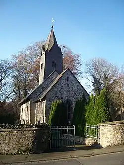 Die Maße des Langhauses basieren auf dem römischen Fuß, was eine Erbauungszeit vor dem 13. Jahrhundert nahelegt.[10] Das Langhaus ist genau 37 römische Fuß lang und 27 römische Fuß breit.[3] Es wird durch Portale an der West- und Südseite erschlossen. Das unregelmäßige Gewände des Südportals geht auf wiederverwendete Teile eines breiteren romanischen Portals zurück. Drei kleine Rundfenster an der Südseite und zwei große Rundbogenfenster an der Nordseite von 1950 belichten den Innenraum. Statt des Emporenzugangs an der Südseite wurde in den 1960er Jahren ein Rundfenster eingelassen.[7] Dem Satteldach ist ein Dachreiter aufgesetzt. Der hohe, verschieferte, quadratische Schaft hat an jeder Seite sehr kleine Schalllöcher für das Geläut. Vier Dreiecksgiebel leiten zu dem vierseitigen Spitzhelm über, der von Turmknauf und Wetterhahn bekrönt wird. Der Dachreiter beherbergt ein Vierergeläut. Die älteste Glocke datiert von 1770. Sie wurde von Freiherr Johann Jacob von Zwierlein gestiftet und von Johann Philip Henschel in Gießen gegossen.[11]