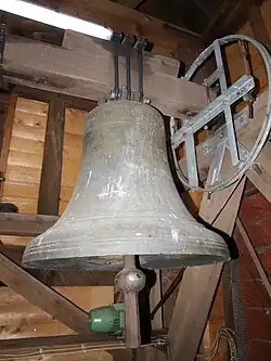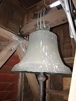 Der Dachreiter beherbergt ein bronzenes Vierergeläut. Die älteste Glocke weist eine Inschrift in gotischen Majuskeln auf. Wahrscheinlich wurde sie im 14. Jahrhundert für das Grünberger Barfüßerkloster (1272–1528) gegossen, das ebenso wie die Glocke dem heiligen Franziskus geweiht war.[20] 1788 goss Friedrich Wilhelm Otto aus Gießen die große Glocke. Aufgrund ihrer historischen Bedeutung mussten die beiden Glocken in den beiden Weltkriegen nicht an die Rüstungsindustrie abgeliefert werden. Die Firma Rincker vervollständigte 1996 das Vierergeläut durch zwei kleine Bronzeglocken.[21] Die Glocken erklingen im Westminster-Motiv.