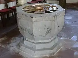 Das pokalförmige, achteckige Taufbecken aus Basaltlava (0,95 Meter Durchmesser, 0,67 Meter hoch) stammt wohl aus der alten Klosterkirche und wird ins 14. Jahrhundert datiert.[17] Es stand lange im Pfarrgarten und vor der Kirche und wurde 1985 restauriert und im Altarbereich aufgestellt. Der Altar wird von einer Platte aus rotem Sandstein bedeckt, die an allen vier Ecken Weihekreuze aufweist.[18]