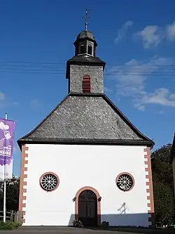 Die weiß verputzte Kirche auf rechteckigem Grundriss hat einen dreiseitigen Chorabschluss und ein hohes verschiefertes Satteldach, das an jeder Seite mit drei Gauben besetzt ist.[1] Ein rundbogiges Westportal aus wiederverwendetem Lungstein aus romanischer Zeit[12] erschließt das Gebäude, hohe rundbogige Fenster an drei Seiten belichten es. An der Westseite flankieren zwei Rundfenster das Portal. Der zweigeschossige Dachreiter schließt bündig mit dem Westgiebel ab.[13] Er entwickelt sich aus einem kubusförmigen Glockengeschoss. Ein geschweiftes Pultdach leitet zum kleinen oktogonalen Obergeschoss mit welscher Haube über, die von Knauf, schmiedeeisernem Kreuz und Wetterfahne mit der Inschrift „D. H. 1754“ bekrönt wird.[14]