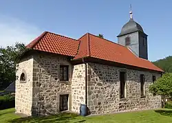 Bereits 1606 war eine sehr alte Kirche vorhanden. Die heutige Saalkirche aus Bruchsteinen mit einem Kirchenschiff aus drei Jochen und einem eingezogenen ehemaligen Chor im Westen wurde im 18. Jahrhundert umgebaut und geostet. Aus dem Satteldach des Kirchenschiffs, das im Westen abgewalmt ist, erhebt sich im Osten ein quadratischer, schiefergedeckter Dachreiter, hinter dessen Klangarkaden sich der Glockenstuhl mit zwei Kirchenglocken aus Bronze befindet, die 1969 die nach dem Ersten Weltkrieg angeschafften Gussstahlglocken ersetzten. Außerdem beherbergt der Dachreiter die Turmuhr. Darauf sitzt ein geschwungenes Pyramidendach. Die Kanzel steht hinter dem Altar zwischen den beiden Fenstern im Osten. Die Orgel wurde Ende des 18. Jahrhunderts gebaut.