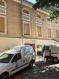 Küche und Lieferwagen des Dienstes „Essen auf Rädern“ im Innenhof der Margarethenkirche von Mediaș, Juni 2017