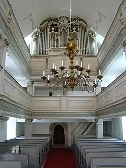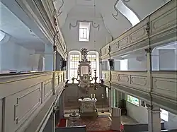 Die Kirche verfügt über einen Kanzelaltar und eine dreiseitig umlaufende hölzerne Empore aus dem späten 18. Jahrhundert. Die Ausstattung weist stilistische Merkmale des Barock und des frühen Klassizismus auf. Der Boden der Kirche ist mit einem historischen Keramikplattenboden bedeckt, der durch den Wechsel von weißem Gipsestrich mit den roten Keramikplatten ein Schachbrettmuster aufweist.