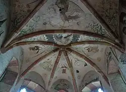 In der Apsis sind fünf Personen des Alten Bundes dargestellt: Moses, König David, Elias, Noah und Abraham. Darüber sind fünf musizierende Engel und schließlich Gottvater abgebildet, der die Erdkugel in seinen Händen trägt. In der Decke sind zwischen den Kreuzrippen die Symbole der vier Evangelisten gemalt worden: der Stier für den hl. Lukas, der Adler für den hl. Johannes, der Löwe für Markus und der Mensch für Matthäus.