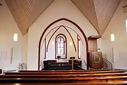 Dem Faltdach der Kirche entspricht im Inneren eine Faltdecke. Der Boden ist mit Steinplatten aus Grauschiefer belegt.[12] An der südlichen Seite des Chorbogens ist die viereckige Kanzel mit entsprechendem Schalldeckel angebracht. Das quadratische Bildrelief mit rundem Motiv an der Vorderseite der Kanzel zum Thema Schöpfung und Neuschöpfung gestaltete die Künstlerin Gertrude Reum. Ein Ehepaar stiftete es 2009 der Gemeinde. Über dem westlichen Eingang der ansonsten emporenlosen Kirche ist eine kleine Orgelempore eingebaut. Das schlichte hölzerne Kirchengestühl bildet einen Mittelblock.