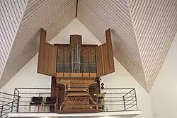 In der alten Kirche baute ein unbekannter Orgelbauer 1821 eine Orgel, die über sieben Register auf einem Manual ohne Pedal verfügte. Der fünfachsige Prospekt hatte einen überhöhten Mittelturm, der von zwei Flachfeldern flankiert wurde, und außen zwei mittelgroße hochrechteckige Felder mit Blindflügeln aus durchbrochenem Rankenwerk. Sie wurde 1891 durch Orgelbauer Eichhorn aus Weilmünster repariert. 1954 baute die Firma Walcker ein zweimanualiges Werk mit selbstständigem Pedal und insgesamt neun Registern in neuzeitlicher Formsprache. Beim Kirchenneubau 1965 wurde das Instrument an die Marktkirche Wiesbaden verkauft. Es stand dort bis 1982 auf der Kaiserloge und diente als Chororgel.[15] 1969 baute Gerald Woehl eine neue Orgel mit elf Registern auf zwei Manualen und Pedal.[16] Es ist einer seiner ersten selbstständigen Orgelneubauten. Der fünfachsige, holzsichtige Prospekt hat ein überhöhtes Mittelfeld, das von zwei gleich hohen Pfeifenflachfeldern flankiert wird. Mit den seitlichen Flügeltüren kann der Prospekt geschlossen werden. Die barock konzipierte Disposition lautet wie folgt:[17]