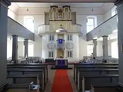 An der Nordseite ragt die zweigeschossige, abgerundete Sakristei in den Raum hinein. Über der Sakristeitür inmitten von vier rechteckigen Fenstern hängt die runde Kanzel. Ihre Füllungen sind mit goldenem Rankenwerk bemalt. Der Kanzelkorb wird von zwei ovalen Spruchvignetten mit zwei weiteren Seligpreisungen flankiert. Das Geländer im Stil des Rokoko wurde aus Kloster Arnsburg übernommen. Über der Sakristei ist eine vorkragende, geschwungene Orgelempore angebracht, an dessen Brüstung der runde Schalldeckel der Kanzel befestigt ist, der mit einem Rautenfries belegt ist. Der hölzerne Blockaltar ruht auf einer dunklen Steinplatte. Das Gestühl ist auf die drei Prinzipalstücke ausgerichtet.[1]