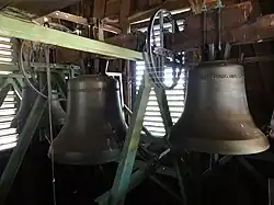 Die Kirche beherbergt ein Dreiergeläut. Mitte des 19. Jahrhunderts waren eine Glocke von Johann Peter Bach (Windecken 1763), von Johannes und Andreas Schneidewind (Frankfurt 1714) sowie eine mittelalterliche Glocke, die aus dem Kloster Arnsburg übernommen war, vorhanden.[13] Zwei gesprungene wurden 1896 durch Glocken von Franz Schilling und Karl Friedrich Ulrich ersetzt und mussten im Ersten Weltkrieg als Metallspende abgegeben werden. Die dritte Glocke, die Friedrich Otto in Gießen 1855 umgegossen hatte, wurde 1920 verkauft. Mit dem Erlös wurden im selben Jahr drei Stahlglocken angeschafft, die als Gemeinschaftsarbeit von Buderus und Rincker entstanden.[14] Die größte (1,10 Meter Durchmesser) hatte den Schlagton gis1 und trug die Inschrift: „In schwerer Zeit dem Herrn geweiht, Herr hilf und jetzt und in Ewigkeit.“ Die zweite (0,86 Meter Durchmesser) mit dem Schlagton h1 hatte als Inschrift: „Gerechtigkeit erhöht ein Volk, aber die Sünde ist der Leute Verderben.“ Die dritte (0,76 Meter Durchmesser) mit cis2: „Wer aber beharret bis ans Ende, der wird selig.“[15] Damit waren die Glocken im Te Deum-Motiv gestimmt. Das Geläut wurde 1962 elektrifiziert. Im Jahr 1993 wurden die Stahlglocken aus klanglichen Gründen vom Turm geholt und durch drei Bronzeglocken der Firma Rincker im gleichen Motiv, aber der um einen Halbton höheren Tonfolge a1-c2-d2, ersetzt.
