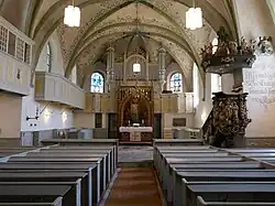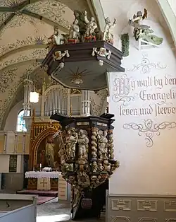 Die aus dem Jahr 1733 stammende Barockkanzel ist reich mit geschnitzten Figuren geschmückt. Die Inschrift auf einer kleinen Tafel lautet: Das Gesetz ist durch Moses gegeben, die Gnade und Wahrheit ist durch Jesus Christus worden (Joh. 1, 17). Thematisch angeordnet sind zu sehen: Moses mit der Gesetzestafel, der auferstandene Christus mit der Kreuzesfahne und das Lamm Gottes, das der Welt Sünden trägt. An den beiden Seiten sind die vier Evangelisten mit den Symbolen Löwe, Stier, Mensch und Adler angeordnet. Die Vorsprünge und freien Flächen sind mit Engelsköpfen ausgestattet und mit reichen Fruchtgehängen und Blumendarstellungen geschmückt. Auf dem Schalldeckel sind reihum die ersten zehn Propheten des alten Testamentes zu sehen. Oberhalb des Schalldeckels befindet sich ein Pelikan, der sich die Brust aufreißt. In den Jahren 1984 bis 1988 wurden die Figuren restauriert und wieder mit ihren alten Fassungen in schlichten Pastellfarben versehen.