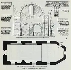 Ursprünglich dreischiffige Pfeilerbasilika von zwei Jochen Länge im gebundenen System ohne Querhaus und ohne baulich separaten Chorraum; alle Schiffe mündeten in Apsiden. Im Hauptschiff auf die Pfeiler durchgezogene Wandschilde sowie Kastenvorlagen verweisen zumindest auf eine geplante, möglicherweise auch ausgeführte Wölbung im Hauptschiff, die im Westen etwas verkürzten Seitenschiffe waren nach den in der Außenwand erhaltenen, vorstehenden Kämpferplatten sicherlich gewölbt.