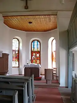 Die Kirche ist ein verputzter Bruchsteinbau mit 14,50 m Länge, 9,20 m Breite und 5 m Höhe im Kircheninneren. Das Kirchenschiff mit rundbogiger Holzdecke wurde 1716 in der gleichen Größe wie der Vorgängerbau erbaut. Der etwas ältere flachgedeckte Chor stammt wohl aus dem Ende des 17. Jahrhunderts. Die Kirche besitzt eine steinerne Renaissance-Kanzel von 1682 mit beachtlichen Reliefverzierungen im Stil von Metallkartuschen, einer Rosette und zwei grotesken Masken.[1]