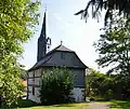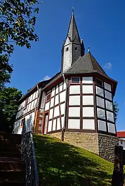 Das Schiff besteht daher im Untergeschoss aus Stein, im Obergeschoss aus an den Giebelseiten verschiefertem Fachwerk. Auf dem Pseudomansarddach befindet sich ein achteckiger Dachreiter mit Spitzhelm. Der kleine Fachwerkchor schließt dreiseitig. Das Westportal stammt von 1806.