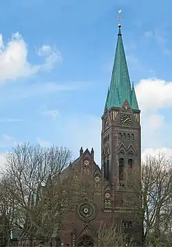 Die asymmetrische Emporenkirche zu drei Jochen, mit gerade schließendem Chor an der Westseite, wurde von 1903 bis 1905 nach Plänen von Arno Eugen Fritsche errichtet. Der Kirchturm mit hohen Schallöffnungen und einem spitzen Helm steht im Osten. Der Backsteinbau ist allseitig reich gegliedert und mit Bauzier aus Formsteinen und farbig glasierten Ziegeln in der Art der norddeutschen Backsteingotik verziert. Das Portal in der Fassade befindet sich unter einem Blendgiebel. Im breiten Mittelschiff wurden dreiteilig gebrochene Holzdecken eingezogen. Im nördlichen Seitenschiff steht eine Empore.