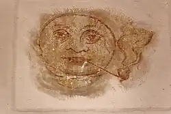 Ein Kuriosum ist eine kleine Wandmalerei an einer Seitenwand des Turms, die in die Chorempore hineinragt. Sie zeigt ein Mondgesicht, das Pfeife raucht. Dabei soll es sich um ein Überbleibsel einer früheren Wandmalerei handeln.[57] In früheren Jahrhunderten hatten Bauern in Dudenhofen auch Tabak und Wein angebaut. Der Tabak wurde auf dem Dachboden der Kirche getrocknet.[58]