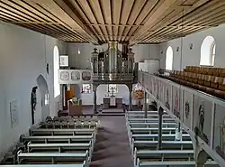 Die Empore ist mit Aposteldarstellungen in den Brüstungsfeldern aus dem Jahre 1751 verziert. Das Kruzifix stammt aus dem Jahre 1698.