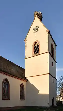 Der dreigeschossige Turm wurde vermutlich im späten 14. Jahrhundert errichtet. Der spätgotische Chor, der aus einem 5/8-Achteck besteht, stammt vermutlich aus der Zeit um 1450. Die Schlusssteine des Kreuzgewölbes im Chor zeigen eine Blume und das hachbergisch-badische Wappen, das Markgraf Rudolf IV. bis 1457 führte.