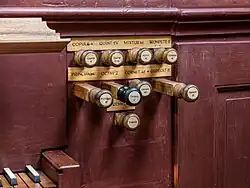 Die Orgel hat eine mechanische Spiel- und Registertraktur mit acht Registern. Die Spieleinrichtung befindet sich an ihrer Seite des Instruments und verfügt über ein Manual und ein angehängtes Pedal.[17][18]