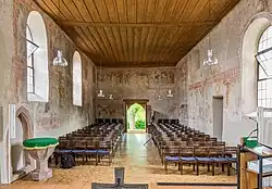 Durch die im Übrigen nicht durchbrochene Westwand führt das einfache hölzerne Eingangsportal in das Gebäude. Auf ihrer Nordseite sind noch die Stufen der ehemaligen Treppe zur Empore zu erkennen.