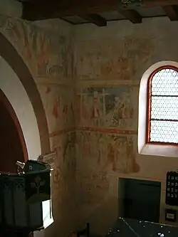 1901/02 wurden unter dem in früheren Jahrhunderten angebrachten Verputz Reste von Wandmalereien entdeckt und freigelegt. Der so sichtbar gewordene, in drei Registern aufgebaute Bildzyklus befindet sich auf der Triumphbogenwand und auf jeweils zwei bis drei Metern der anschließenden nördlichen und südlichen Langhauswand.