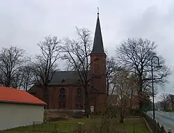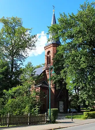 Bei der evangelischen Kirche in Gröditz handelt es sich um einen im neuromanischen Stil errichteten Klinkerbau aus dem 19. Jahrhundert. Die Saalkirche befindet sich auf einem Bruchsteinsockel und besitzt ein Satteldach. Im Osten befindet sich ein rechteckiger 29,64 Meter hoher Turm mit einem achteckigen, schiefergedeckten Dach. Die Chorseite und die beiden Längsseiten des Schiffs sind durch Fenster und Lisenen gegliedert. Unterhalb des Dachgesimses befindet sich ein umlaufender plastischer Würfelfries.[3][2][4]