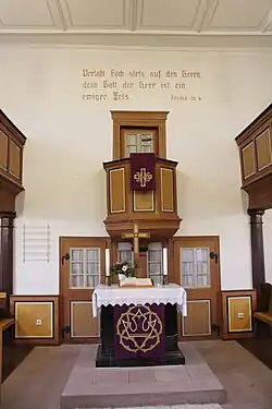 Durch die Abtrennung des Chorturms bildet das Schiff heute einen flach gedeckten Saalbau. Raumbestimmend sind die axial ausgerichtete Kanzel an der Ostwand, der davor stehende Altar und die dreiseitige Empore mit der Orgel auf der Westseite.[12] Vor dem Neubau von 1841 stand die Kanzel seitlich an der nördlichen Ecke.[6] Das gesamte Holzwerk ist farblich in verschieden hellen Brauntönen gehalten. Ein Wandspruch über der Kanzel lautet: „Verlaßt Euch stets auf den Herrn, denn Gott der Herr ist ein ewiger Fels, Jesaja 26, 4“. Fresken in den Fensternischen des Turms werden auf das 14. Jahrhundert datiert. Sie sind jedoch übertüncht.[6] Bei einer Renovierung in den Jahren 1967–1968 wurde der Innenraum einheitlich in einem spätklassizistischen Stil der Zeit um 1850 wiederhergestellt. Da auch der damalige Altar mit seiner dunklen Holzverkleidung nicht in das angestrebte Gesamtbild passte, wurde er durch einen Altar aus schwarz-weißem Lahnmarmor ersetzt, der aus einer Kirche bei Idstein stammte. Die Gemeinde im Taunus hatte ihn unentgeltlich abgegeben. Die fehlende Rückwand des Altars konnte mit Schupbacher Marmor nachgefertigt werden, obwohl der Marmorabbau dort bereits eingestellt war.[14]