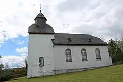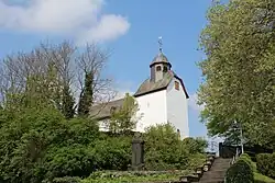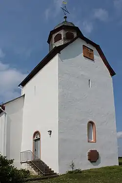 Die Kirche liegt auf einem kleinen Hügel am Ortsrand.[12] Einen großen Dorfbrand am 23. August 1798, dem 12 Gehöfte zum Opfer fielen,[6] überstand sie unbeschadet. Das Gebäude besteht aus einem Turm, einem Schiff und einem kleinen Eingangsvorbau. Das gesamte Mauerwerk ist in Bruchsteinbauweise errichtet und weiß verputzt. Ältester Teil ist der romanische Turm. Er wird auf die Zeit zwischen 1300 und 1350 datiert. Die Mauerstärke beträgt einen Meter. Seine schmalen Fensternischen waren als Schießscharten nutzbar, sodass von einer wehrhaften Nutzung auszugehen ist. Bei Grabungen im Turm in der ersten Hälfte des 20. Jahrhunderts entdeckte Lehrer Ludwig Schneider in zwei Metern Tiefe ein Einzelgrab mit einer männlichen Leiche. Anhand der aufgefundenen Sarggriffe datierte der Provinzialkonservator der Rheinprovinz, Edmund Renard, das Begräbnis auf das 14. Jahrhundert. Verbrannte Holzteile und Reste des Deckenverputzes im aufgeschütteten Boden deuteten zudem auf einen Brand des Turms hin. Inschriften im Gebälk des Turms verweisen auf eine Erneuerung von Glockenstuhl und Gebälk im Jahr 1680.[6]