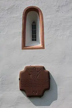An das Gebäude schließt sich der Friedhof an. In die Außenwand des Turms ist der Grabstein für Pfarrer Friedrich Wilhelm Petri und seine Frau Aenne eingelassen, welche am Fuß des Turms begraben liegen. Am Treppenaufgang vom Dorf zur Kirche steht das Ehrenmal für die 13 Gefallenen des Ersten Weltkriegs. Es wurde am 7. Oktober 1923 eingeweiht.[6] und ist in Form eines Pfeilers mit aufgesetztem Eisernen Kreuz gestaltet.[12] Nach dem Zweiten Weltkrieg wurde es um die 27 Namen der Gefallenen des letzten Krieges erweitert.