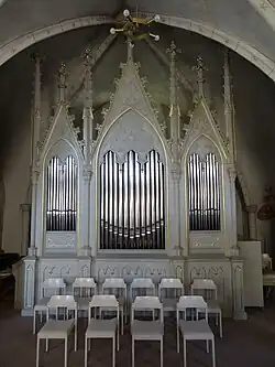 Johann Georg Förster erhielt 1866 den Auftrag für einen Orgelneubau, der nach dem Kontrakt spätestens im August 1868 fertiggestellt werden sollte. Förster begann aber erst im Mai 1870 mit der Aufstellung der heutigen Orgel (Opus 30), die am 26. Juni 1870 abgenommen wurde und 4000 Gulden kostete. An den Chor wurde ein Balghaus für die Windversorgung angebaut. Der neugotische Prospekt ist dreiteilig, mit Spitzgiebeln, Fialen und Kreuzblumen. Eine Besonderheit unter den Registern stellt die Physharmonika dar.[33] Im Zuge von Reparaturverträgen in den Jahren 1888 und 1892 veränderte Förster die Disposition leicht. Im Jahr 1917 musste der zinnerne Prinzipal 8′ aus dem Prospekt an die Rüstungsindustrie abgeliefert werden und wurde 1920 durch Zinkpfeifen ersetzt. Auch die Trompete 8′ ging verloren. 1936 wurde ein elektrisches Gebläse angeschlossen und 1955 eine Überholung der Orgel durchgeführt. Im Jahr 1974 folgte eine Rekonstruktion der beiden verlorenen Register durch Förster & Nicolaus Orgelbau, nachdem sie die Orgel in den Jahren 1969 bis 1973 ins nördliche Querschiff umgesetzt hatten. Ansonsten ist das Instrument einschließlich der seltenen Physharmonika original erhalten. Die Disposition lautet wie folgt:[34]