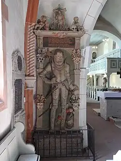 An der westlichen Chorwand ist das 3,50 Meter hohe und 1,05 Meter breite steinerne Grabdenkmal für den 1584 verstorbenen Georg Schutzbar genannt Milchling aufgestellt. Es zeigt den Ritter in seiner vollen Rüstung in einem Rundbogenfeld, das von zwei Pilastern mit Halbsäulen und vier Wappen flankiert wird. Den oberen Abschluss bilden eine Inschriftentafel und ein Gesims mit zwei Putten und dem auferstandenen Christus.[29] An der Südwand des Chors steht ein 2,18 Meter hohes und 0,99 Meter breites Epitaph für die sieben in den Pestjahren 1627 bis 1635 als Kinder gestorbenen Geschwister der Familie Buseck genannt Münch.[30][31]