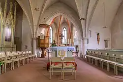 Der 5/8-Chor aus gotischer Zeit ist auf einem unregelmäßigen Grundriss errichtet.[16] Ein großer Spitzbogen vermittelt von der Vierung zum Chor. Das Chorgewölbe des 14. Jahrhunderts weist Birnstabrippen auf und ruht auf Wanddiensten.[25] Die drei östlichen Chorfenster weisen aus Sandstein gefertigte Maßwerke auf; im nördlichen Chorfenster ist das Maßwerk ausgebrochen. Das südliche Chorfenster ist aus Lungstein kunstvoll mit doppelter Kehle und Rundstäben gefertigt. Alle Chorfenster haben Spitzbögen.[26]