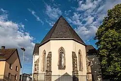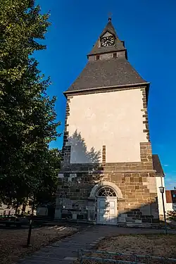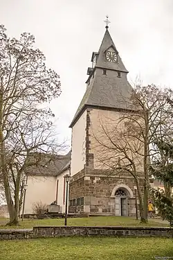Der mächtige Kirchturm auf quadratischem Grundriss besteht im unteren, romanischen Teil aus aufgemauerten Quadern aus hellem Tuffstein und grauem Basaltgestein mit Ecklisenen. Ein umlaufendes Gesims in vier Metern Höhe ist mit einem Rundbogenfries verziert.[16] Das rundbogige, gestufte Westportal führt in eine Vorhalle, die das untere Drittel des Turms einnimmt.[17] Über der Halle mit Kreuzgratgewölbe befindet sich eine Turmkapelle, die wahrscheinlich dem heiligen Michael geweiht war, aber nicht vollständig ausgeführt wurde. An der Ostseite stehen noch zwei Ecksäulen mit grotesken Figuren und Blattwerk auf Kapitellen.[7] Eine 2,40 Meter breite Apsidiole, eine überwölbte Nische an der Ostseite, ist heute zugemauert. Die Kapelle ist über eine mittelalterliche, rundbogige Tür über der Nordempore des Schiffs zugänglich. Die verputzte obere Hälfte des Turmschaftes aus Bruchsteinmauerwerk mit Eckquaderung ist fensterlos und stammt aus gotischer Zeit.[18] Das vierseitige, verschieferte Pyramidendach ist zweistufig und wird in der Mitte durch eine schmale Zone mit je zwei kleinen rechteckigen Schalllöchern unterbrochen. Bekrönt wird das Dach von einem Turmknopf, Kreuz und Wetterhahn, der bereits für das Jahr 1611 nachgewiesen ist.[19]