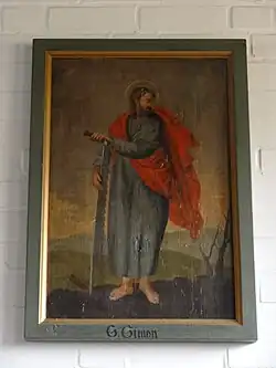 Die Turmhalle setzt den Gemeindesaal fort, kann aber auch von diesem abgetrennt und separat genutzt werden. Hier sind etwa 20 weitere Ölgemälde desselben Künstlers aufgehängt. Sie stellen biblische Szenen aus dem Alten und Neuen Testament,[8] aber auch außerbiblische Figuren wie Paulus von Theben dar, die mit ihren jeweiligen Attributen gezeigt werden. Unterhalb der Bilder sind auf dem Rahmen die Namen der betreffenden Person oder die Bibelstelle aufgemalt.