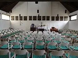 Der Gemeindesaal hat einen offenen Dachstuhl, der mit Holz verkleidet ist. Sich kreuzende Streben stützen das Sparrendach, das an der Nordseite ein durchlaufendes Fensterband als Oberlicht hat. Der Altarbereich liegt im Westen. An der Westwand sind 13 barocke Ölgemälde angebracht, die zentral Christus mit 10 Aposteln zeigen, die außen von Mose und Aaron flankiert werden.[8] Darunter sind Kanzel, Altar und Lesepult aufgestellt, die alle schlicht und funktional aus Holz mit Eisenrahmen gefertigt sind. Die Kirche ist mit weißen Einzelstühlen bestuhlt und bietet 250 Besuchern Platz. An der Ostwand, der Rückseite des Turms, ist eine Orgelempore eingebaut, auf der die Orgel vor einer Rundbogennische steht.