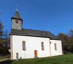 Die Kirche auf rechteckigem Grundriss hat starke Außenmauern, die auf das 13. Jahrhundert hinweisen.[1] Sie wird durch ein spätromanisches Westportal (1,22 Meter breit, 2,21 Meter hoch) mit Rundbogen über Kämpferplatten mit Schräge, das später überdacht wurde, und durch ein rechteckiges Südportal (0,73 Meter breit, 1,72 Meter hoch) erschlossen.[17] Rechteck- und Rundfenster belichten den Innenraum. Unter dem verschieferten Westgiebel sind zwei und in der südlichen Chorwand ein Rundfenster eingelassen, in der Südseite des Schiffs zwei und an der Ost- und Westseite je ein Rechteckfenster. Die Nordseite ist fensterlos. Die roten Gewände (0,12 Meter breit) aus Basalt stammen aus dem 18. Jahrhundert und heben sich von den mittelalterlichen Umrahmungen ab.[18] Über dem Südportal ist eine Schrifttafel mit Girlanden und Putten angebracht, die auf den Umbau in den Jahren 1810/1811 hinweist: „Diese Kirche ist erbaut und Renoviert worden im Jahr Christi anno 1810 und 1811. Der bau-Meister ist gewesen Johann Konrad Keil“.[14]