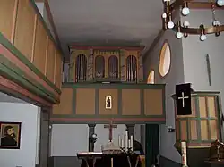 Über die erste Orgel, für die 1811 eine Empore eingebaut wurde, gibt es keine näheren Angaben. Friedrich Wilhelm Bernhard baute 1861 hier seine letzte Orgel, bevor die Romroder Firma erlosch. Das vorderspielige Instrument verfügt über sieben Register, die sich auf einem Manual und ein fest angekoppeltes Pedal verteilen. Der Prospekt zeigt vier Rundbogenfelder zwischen marmoriert gestrichenen Pilastern. Im Jahr 2019 erfolgte eine umfassende Sanierung der Orgel. Der Winddruck wurde dabei etwas abgesenkt, um die historische Substanz zu schonen. Die Disposition lautet wie folgt:[21]