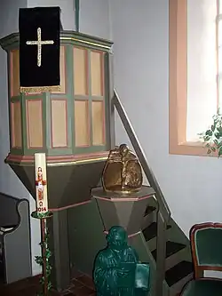 Die hölzerne, polygonale Kanzel mit kassettierten Füllungen in den Kanzelfeldern ist an der Südwand auf einem viereckigen Holzpfosten aufgestellt.[1] Das Kirchengestühl, der Altar und die tragende Konstruktion der Emporen stammen von 1965.[14] Das moderne Taufbecken aus rotem Marmor ruht auf einem vierseitigen Fuß. Zu den Vasa sacra gehört eine Zinnkanne, die 1758 gestiftet wurde.[20]