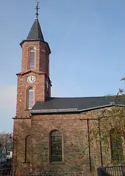 Im Ortskern von Hausen liegt die Kirche an einer Aufweitung der Hausener Obergasse und der Straße Alt-Hausen. Der Fassadenturm auf der westlichen Eingangsseite der Saalkirche prägt das Ortsbild. Das neun Meter schmale und knapp zwanzig Meter lange Gebäude hat eine steinsichtige Fassade aus grob behauenem rotem Sandstein und dunkler Basaltlava. Der Turm hat einen quadratischen Grundriss, der oberhalb der Uhr in eine oktogonale Form übergeht und von einer gleichermaßen geformten, spitzen Haube gedeckt ist. Das Walmdach ist mit Schiefer gedeckt. Über dem Eingangsportal ist ein kreisrundes Fenster angeordnet. Rundbogenfenster und Pilaster mit Tympanon gliedern die Fassaden.