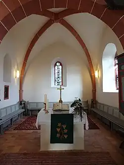 Im Chor stehen an den drei Wänden hölzerne Kirchenbänke. Die neuzeitliche Steinmensa wird von einer profilierten Platte bedeckt. In der nördlichen Chorwand befinden sich zwei Sakramentsnischen, die mit Eisengitter verschlossen sind. An der Südseite ist außen der Auslauf einer Piscina erhalten.[10]