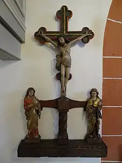 Die polygonale Kanzel in rot-blauer Fassung mit kleinem Schalldeckel datiert aus dem 17. Jahrhundert. Sie ruht am südlichen Triumphbogen auf einem viereckigen Holzpfosten und hat profilierte Felder im Kanzelkorb. Links vom Bogen ist eine spätgotische Kreuzigungsgruppe mit Jesus, Maria und Johannes angebracht.[1] Die Figuren der Maria und des Johannes werden um 1380 bis 1390 datiert, das spätgotische Kreuz, das ursprünglich als Vortragekreuz gedient haben könnte, ins 15. Jahrhundert, als die Kreuzigungsgruppe zusammengestellt wurde. Der Gekreuzigte (Dreinageltypus) ist vermutlich etwas älter als das Kreuz.[3]