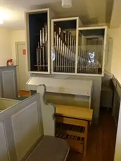 Im Jahr 1974 ersetzte Förster & Nicolaus Orgelbau die Orgel durch einen Neubau, der auf der Ostseite der Nordempore errichtet wurde. Einige ältere Register wurden umgearbeitet und integriert.[12] Wie die Vorgängerorgel verfügt die Orgel über sieben Register, die sich auf einem Manual und Pedal verteilen. Der Prospekt wird durch drei vorne und hinten offene Kästen unterschiedlicher Höhe gegliedert. Die Holzpfeifen des Subbass sind hinterständig aufgestellt. Die Disposition lautet wie folgt:[13]