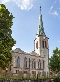 Die derzeitige asymmetrisch gruppierte neugotische Saalkirche wurde von 1899 bis 1900 von einem Baurat Böhmer errichtet. Die Apsis steht auf einem polygonalen Grundriss, der Emporenannex ist zweijochig ausgeführt. Der Turm steht auf der Nordseite. Der Bau aus hammerrechtem Bruchstein ist durch Werksteinkanten gegliedert. Die Apsis ist rippengewölbt und in den Saal wurde eine ansteigende Flachdecke eingezogen. Die Kirche wurde 1924 mit zwei neuen Glocken ausgestattet. Ein Umbau wurde 1971 vorgenommen, ein neues Orgelwerk wurde 1975 installiert. Der Kirchturm wurde 2009 saniert.