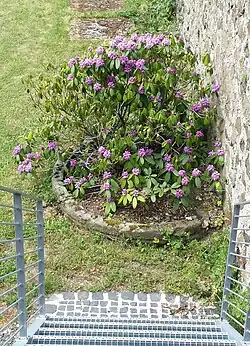 Gegenüber der Kirche liegt im Renteigarten der Burg ein halb im Boden vergrabenes, mit spätgotischen Stilelementen verziertes Steinbecken. Wahrscheinlich handelt es sich dabei um einen alten Taufstein. Den Ornamenten nach dürfte er aus der Entstehungszeit der Kirche stammen. Denkbar ist, dass er bei Einführung des reformierten Bekenntnisses aus der Kirche entfernt und im benachbarten Renteigarten vergraben wurde. Wahrscheinlich wurde er anschließend durch einen schmucklosen Stein ersetzt, der wiederum 1668 bei den Rekatholisierungsversuchen des Grafen Johann Heinrich Christian aus der Kirche herausgerissen wurde. Spätestens seit 1701 wurde dann eine silberne Taufschale verwendet.[25]
