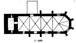 Das spätgotische Schiff der heutigen Kirche wurde laut einer Bauinschrift 1517 errichtet und in gleicher Breite an den bereits bestehenden Westturm angebaut. Über die Baugeschichte des Vorgängerbaus ist nichts bekannt. Es handelt sich um einen dreijochigen Saalbau mit verlängertem Chor im 5/8-Schluss. Im Schiff ist Kreuzrippengewölbe mit Schlusssteinen eingezogen, die Fenster sind spitzbogig und zum Teil mit Maßwerk ausgestattet. An der Südseite befindet sich ein spitzbogiger Eingang, an der Nordseite ein neuzeitlicher Anbau.
