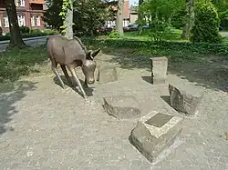 Vor der Kirche steht seit 2004 ein Denkmal, das einen Esel zeigt, der von fünf Steinen umgeben ist. Der Legende nach wurde Isselhorst gegründet, indem Siedler einen mit Steinen bepackten Esel laufen ließen und beschlossen, an dem Ort, wo sich der Esel zuerst hinlegen würde, eine Kirche zu errichten. Tatsache ist allerdings, dass die Keimzelle Isselhorsts der benachbarte Meierhof ist und die Kirche 100 Jahre nach dessen Errichtung als „Hofkirche“ in seine Nähe und damit seinen Schutz gebaut wurde. Die fünf Steine stehen für die fünf Ortschaften des Kirchspiels: Isselhorst, Niehorst, Ebbesloh, Hollen und Holtkamp.