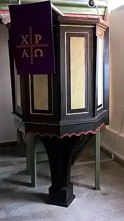 Zu den ursprünglichen Einrichtungsgegenständen aus der Erbauungszeit gehört die schlichte, hölzerne, polygonale Kanzel mit hochrechteckigen Füllungen in den Kanzelfeldern und einem viereckigen Fuß.[1] Der quaderförmige Altar von 1961 ist aus Holz gefertigt. Die schwarze Bemalung mit weißer Aderung imitiert Marmor. Auf dem Altar steht ein Kruzifix des Dreinageltypus. Hinter dem Altar ist in derselben Breite eine Krippe aufgestellt, deren Holzstücke die Form des Kreuzes aufgreifen. Die Krippe wird zur Weihnachtszeit geöffnet und zeigt Szenen der Geburt Christi. Das hölzerne Kirchengestühl lässt einen Mittelgang frei und weist wie die Emporen eine olivgrüne Fassung auf.