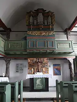 In die Kirche ist eine dreiseitig umlaufende, hölzerne Empore eingebaut, die an der Südseite nur die Hälfte einnimmt, um den Platz vor der Kanzel freizulassen. Achteckige Holzpfosten mit Bügen stützen zwei Längsunterzüge und beziehen die Empore ein. Die Empore hat querrechteckige Füllungen, die mit stilisierten Blumen und Ranken bemalt sind. Die Brüstungsmalereien stammen aus den 1760er Jahren.[9] Die Orgelempore im Osten ist ähnlich, aber im Detail anders gestaltet. Die Jahreszahl 1697 an einem Tragpfosten der Orgelempore deutet auf die Errichtung oder eine Renovierung derselben hin. Der Innenraum wird in der Mitte von einer halbrunden Holztonne abgeschlossen, während über den Emporen eine flache Balkendecke eingezogen ist, deren Zwischenräume verputzt sind.