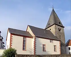 Die Kirche wurde auf einer leichten Erhebung errichtet. Der ungegliederte dreigeschossige, romanische Westturm aus Bruchstein-Mauerwerk mit Lungstein-Eckquadern auf quadratischem Grundriss von 6,7 Meter × 6,7 Meter ist unverputzt und weitgehend erhalten. Die Mauerstärke beträgt 1,9 Meter.[12] Im ersten Geschoss sind schmale Fensterschlitze und im zweiten Geschoss kleine Rundbogenfenster angebracht. Die nach drei Seiten gekuppelten, rundbogigen Fenster im dritten Geschoss weisen auf den romanischen Ursprung und dienten bis ins 20. Jahrhundert als Schallarkaden für das Geläut. Der Glockenturm wird von einem verschieferten Pyramidenhelm abgeschlossen, dessen Form noch aus romanischer Zeit stammt und der von einem Turmknopf, Kreuz und Wetterhahn bekrönt wird. Den Zugang zum Turm gewährt ein rundbogiges Portal an der Südseite. Im Mauerwerk des Turms sind drei Steinbildnisse unbekannter Herkunft aus Basalt eingelassen. An der Westseite ist ein Christuskopf mit Heiligenschein eingemauert, an der Südseite zwei stehende Figuren eines Mannes und einer Frau (das Stifterehepaar?) und über dem Südportal des Turms ist ein stark verwittertes Relief mit Darstellung eines Kopfes. Die Datierung der schwer zu deutenden Bildwerke reicht von frühromanischer bis in die gotische Zeit.[13]